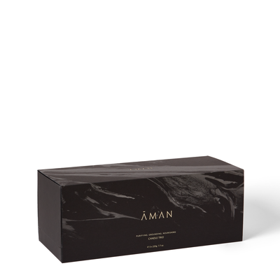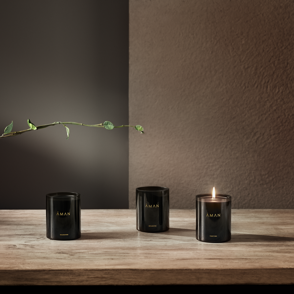 ひとつ60gの小さなキャンドルのギフトセット。精神的欲求からなるステイタスを満たすようデザインされた、アマンエッセンシャルズのアロマの道筋を創っています。